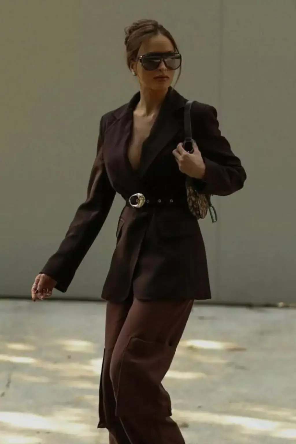 O Blazer é confeccionado em tecido plano, possui modelagem alfaiataria, caimento reto, lapelas peaked, dois bolsos frontais embutidos, fechamento frontal por botão, mangas longas com abotoamento nos punhos, fenda posterior, forro embutido e acabamento pespontado. Acompanha cinto no mesmo tecido com fivela dourada.