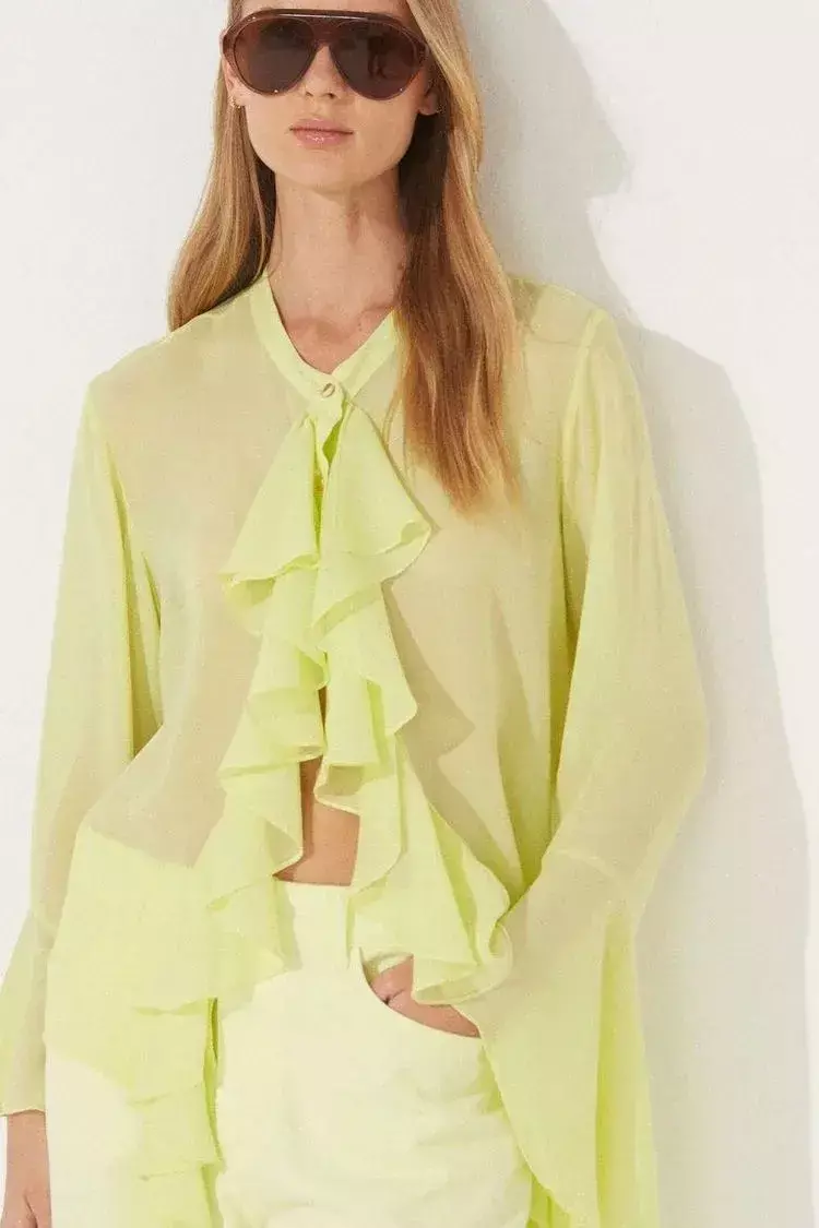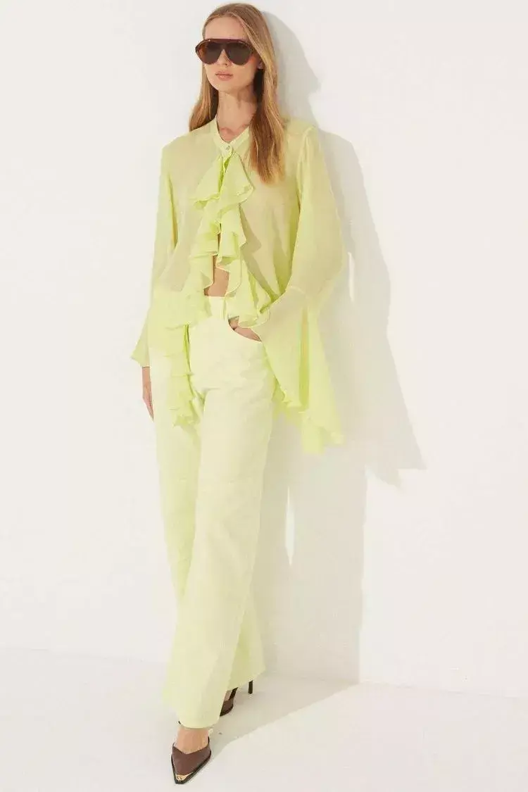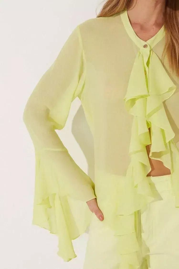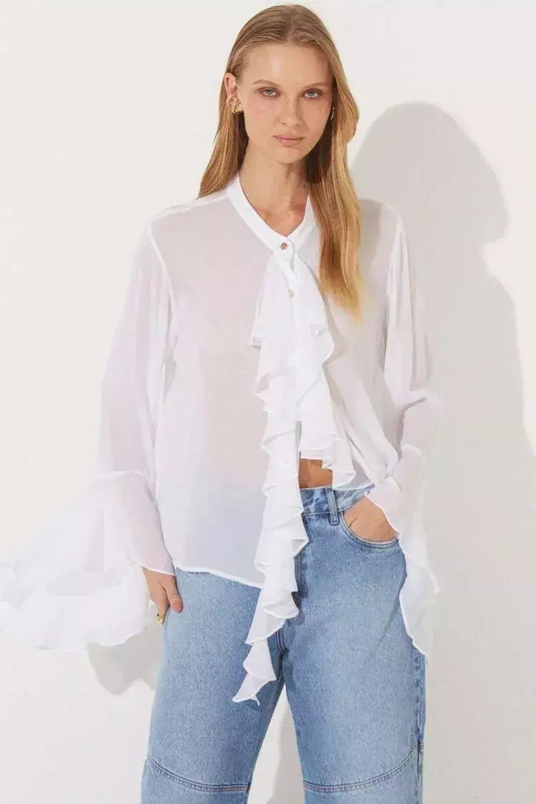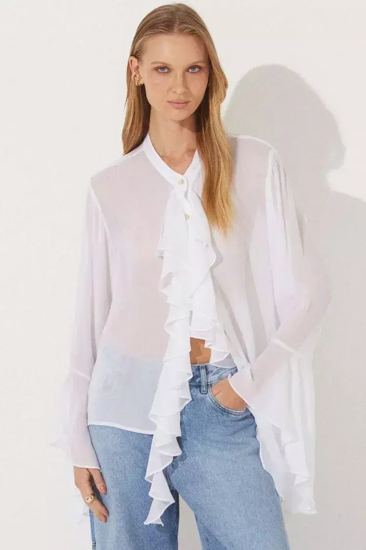 A Blusa é confeccionada em viscose, possui decote ""V"", mangas longas com abotoamento nos punhos, babados aplicados, e acabamento pespontado."
