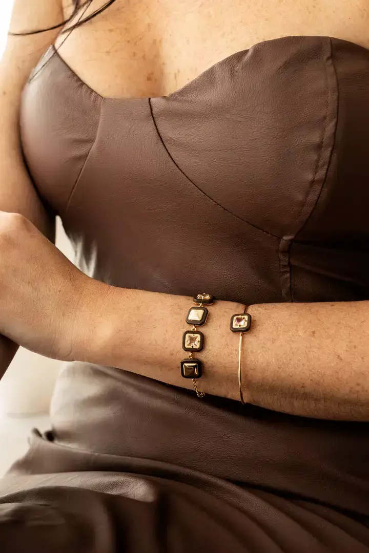 BRACELETE AMOUR QUADRADO RESINADO MARROM E ZIRCÔNIA.