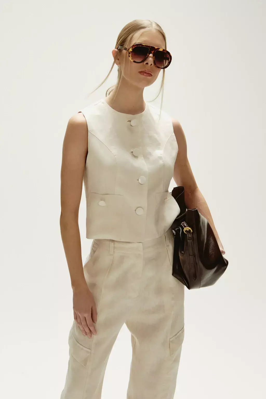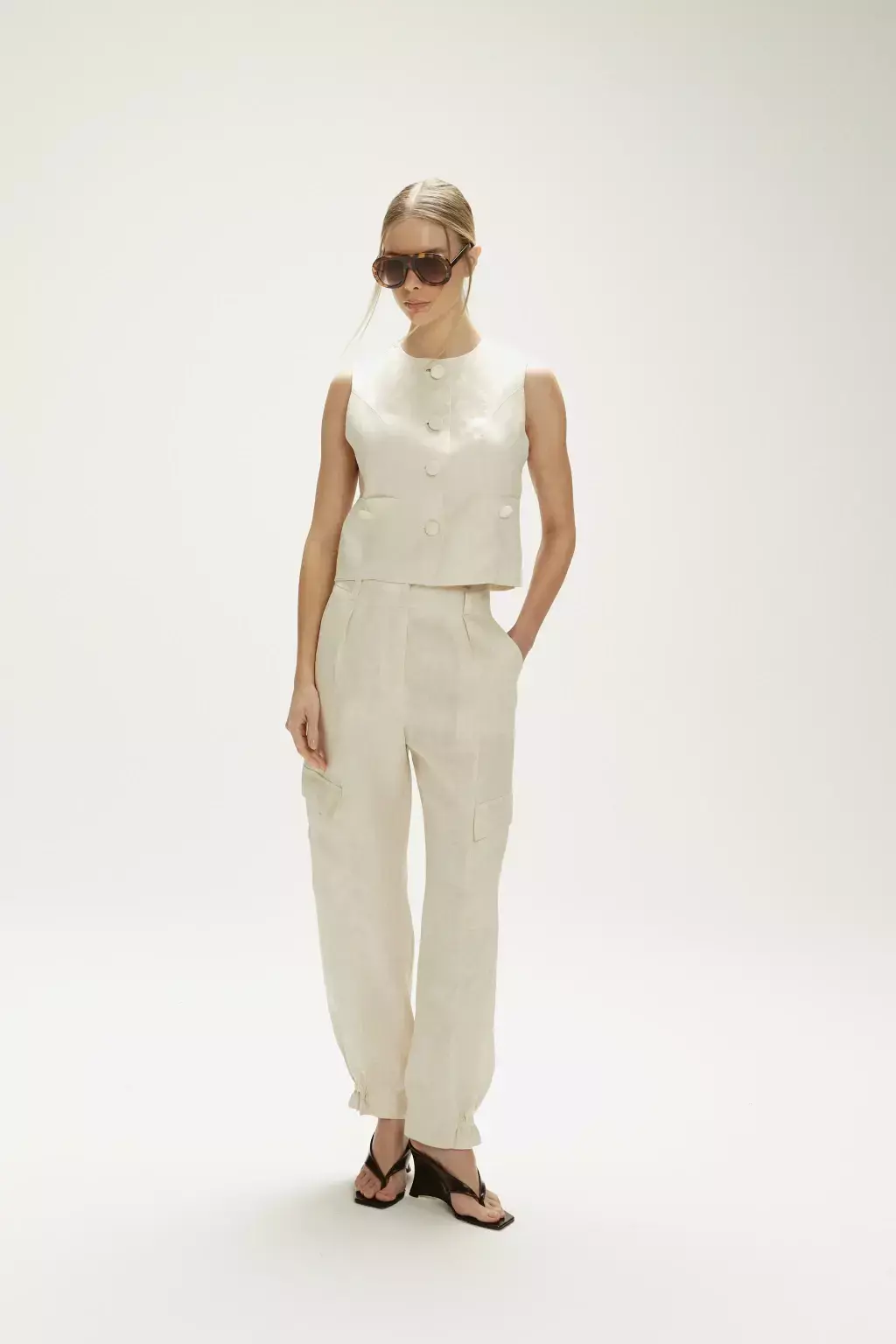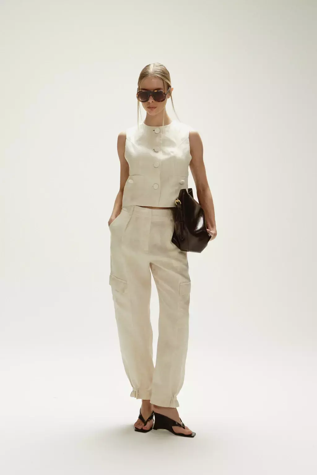 A Calça é confeccionada em linho, possui modelagem de alfaiataria, caimento reto, cós com passantes, fechamento frontal por zíper, bolso cargo, nervuras verticais, detalhe nas laterais das barras e acabamento premium.