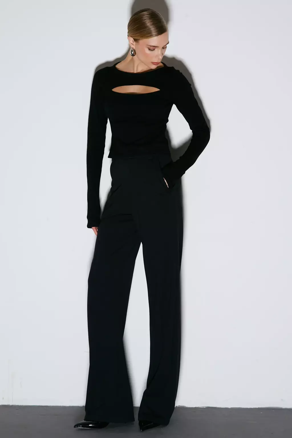 Calça confeccionada em malha exclusiva da Zen na cor Preto. A peça possui modelagem pantalona, cintura alta, passante de cinto, detalhe com friso na parte frontal, bolsos frontais e traseiros. Fechamento com zíper e botão.