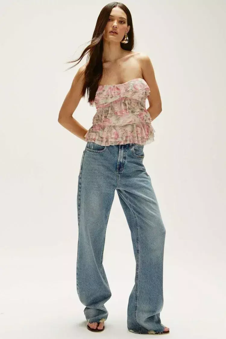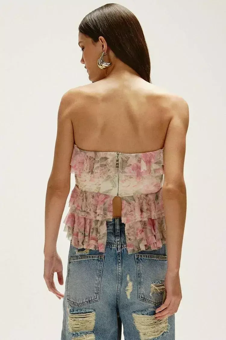 O corselet é confeccionado em tule em camadas, possui modelagem alfaiataria, caimento acinturado, modelo sem alça, decote estruturado, detalhe delicado de babados, fechamento posterior por zíper e acabamento premium.