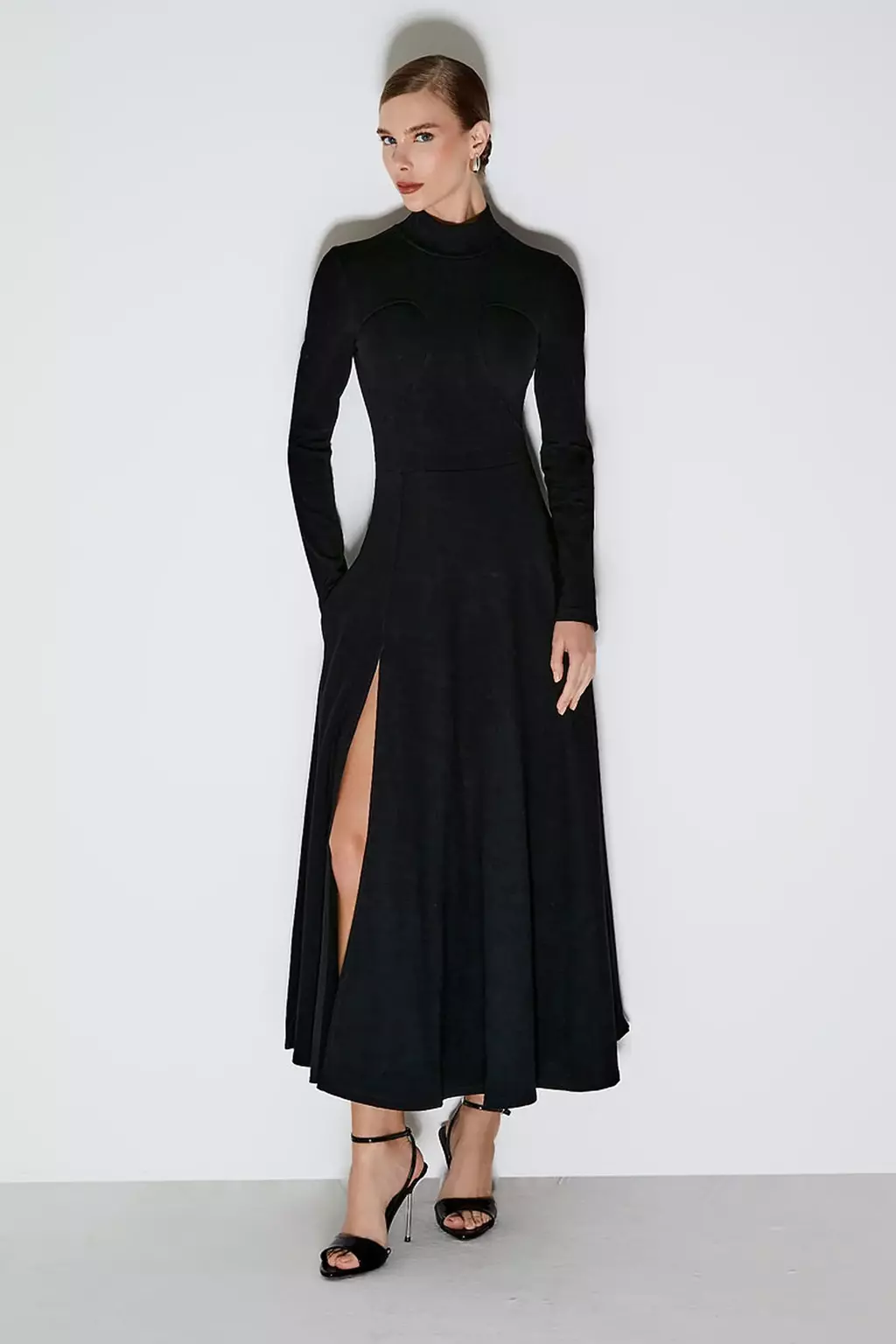 Vestido confeccionado em malha de viscose exclusiva da marca na cor Marrom Chocolate. A peça possui comprimento midi, caimento ajustado ao corpo, gola alta, mangas longas, detalhe de recorte no busto e saia ampla com fenda. Fechamento por zíper nas costas.