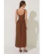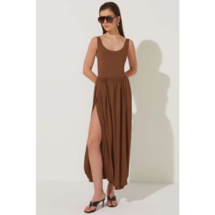 Vestido marrom de comprimento mídi confeccionado em malha premium de poliamida (88% Poliamida e 12% Elastano). Apresenta alças, decote em U, caimento acinturado, saia evasê com tecido sobreposto e fechamento por zíper nas costas.